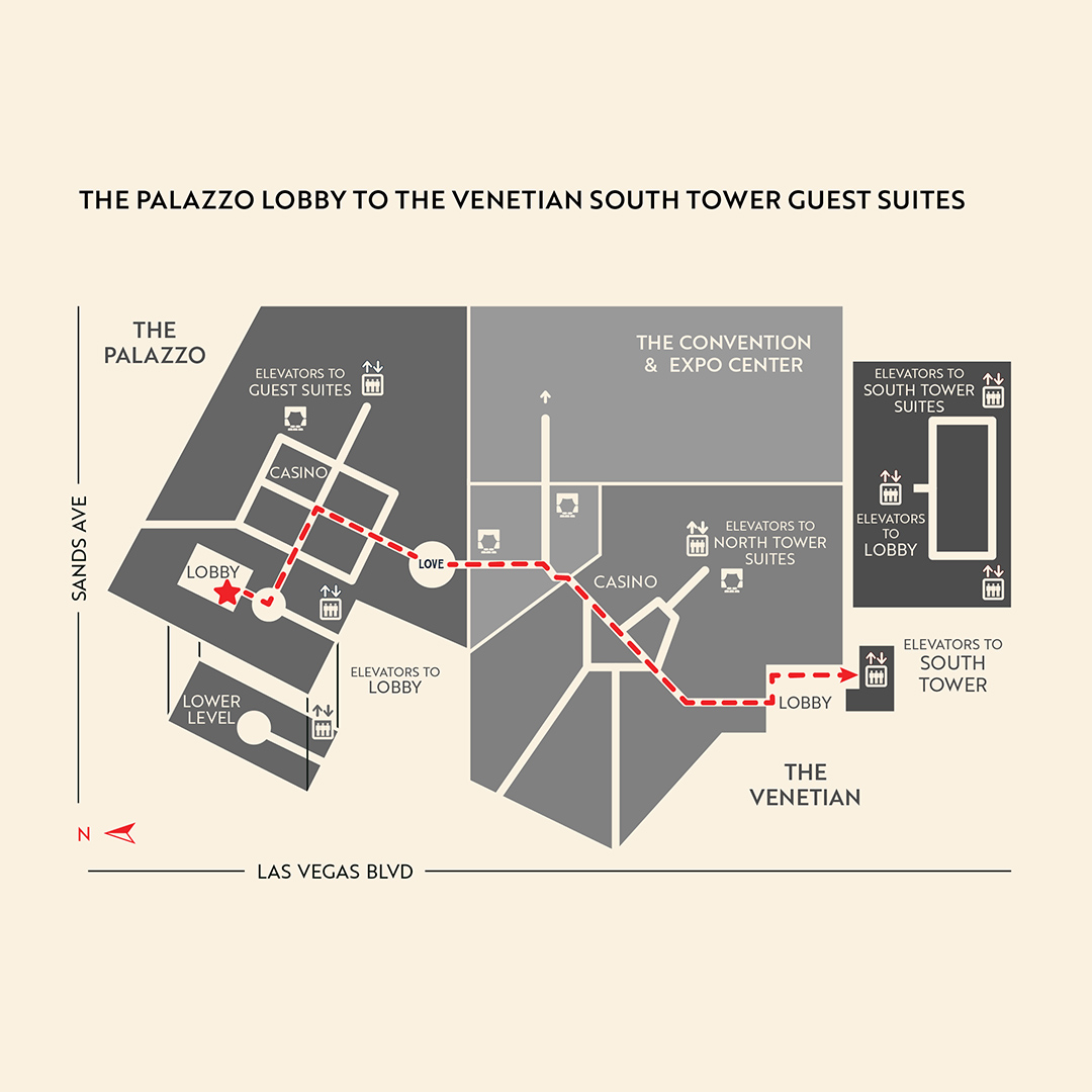 Welcome to The Venetian Resort! Please view the below for walking directions to your suite.